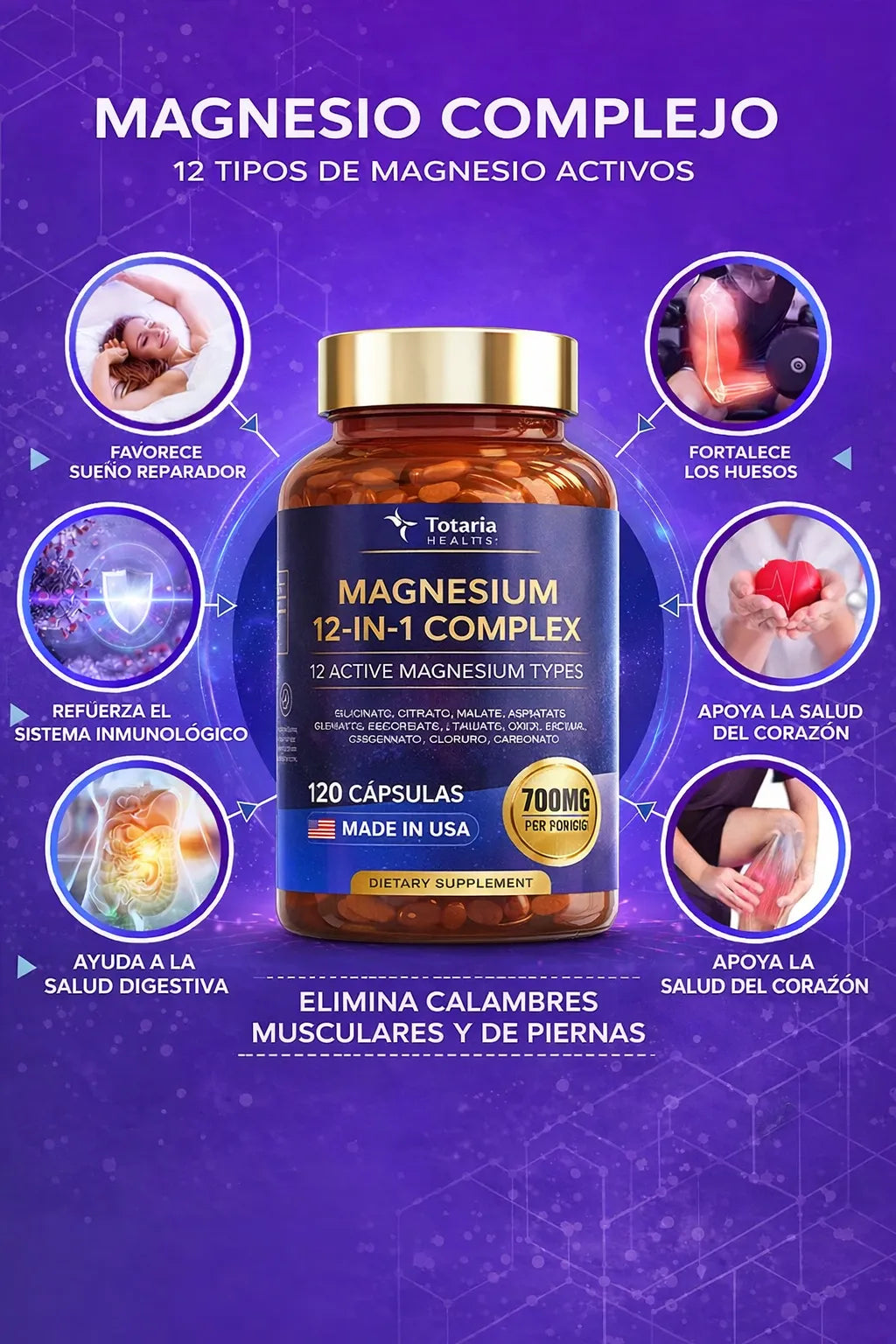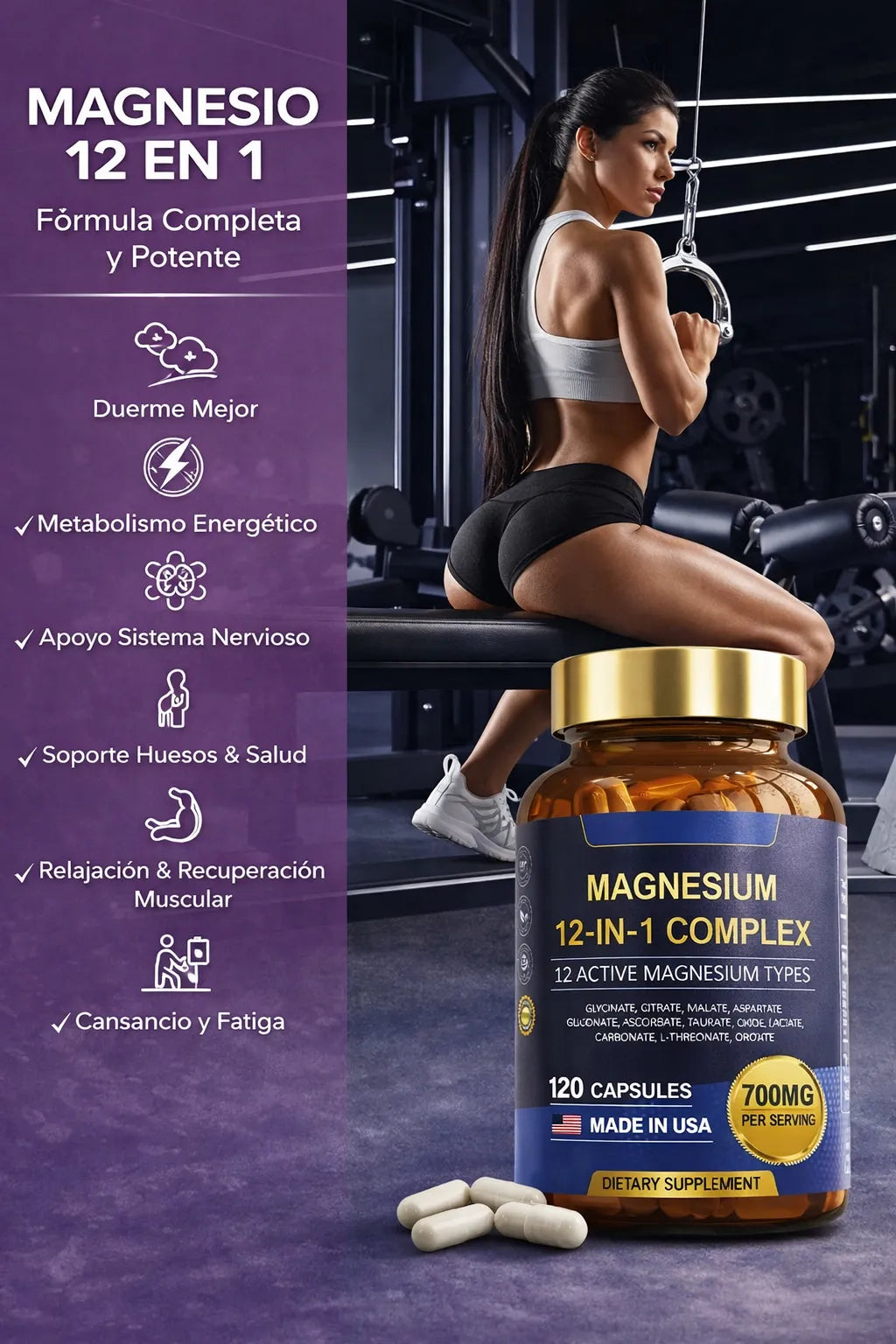Combinación de formas de magnesio para absorción constante, reduce calambres, acelera recuperación y mejora sueño, transformando tu rutina diaria.